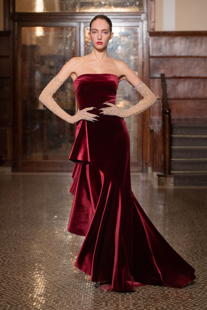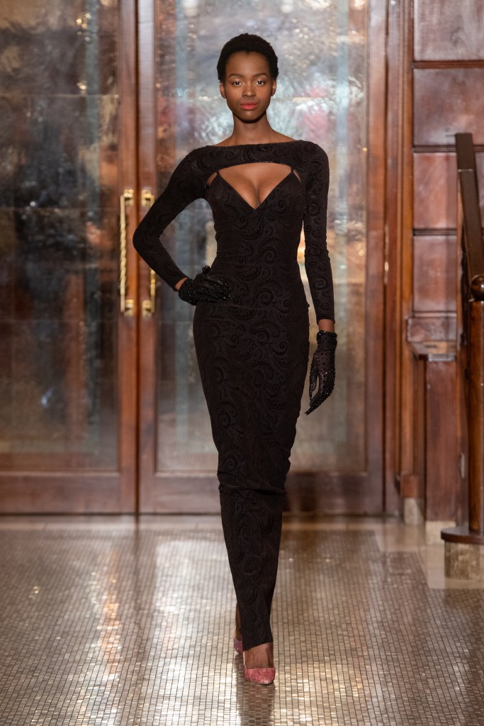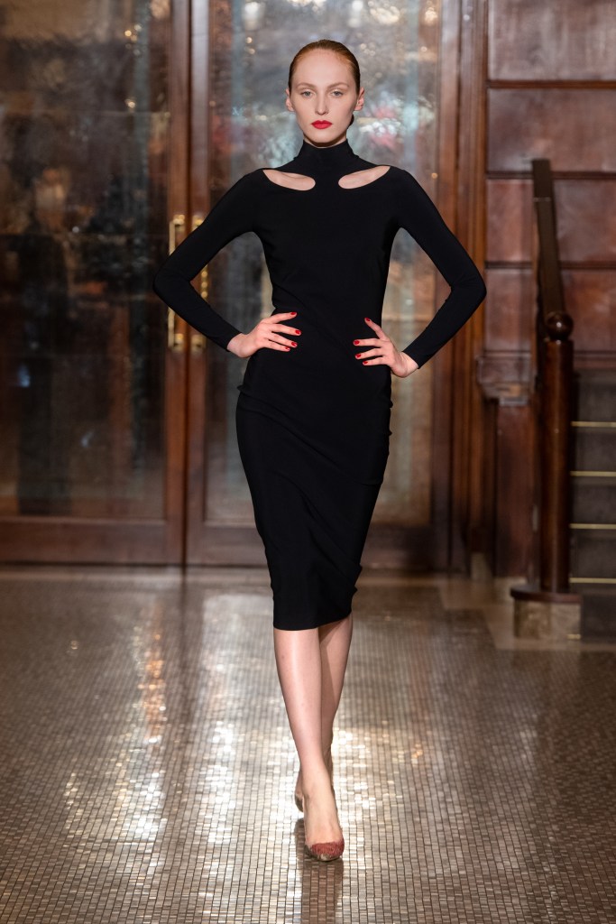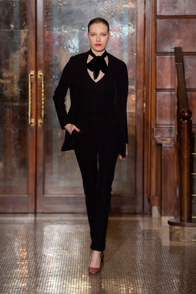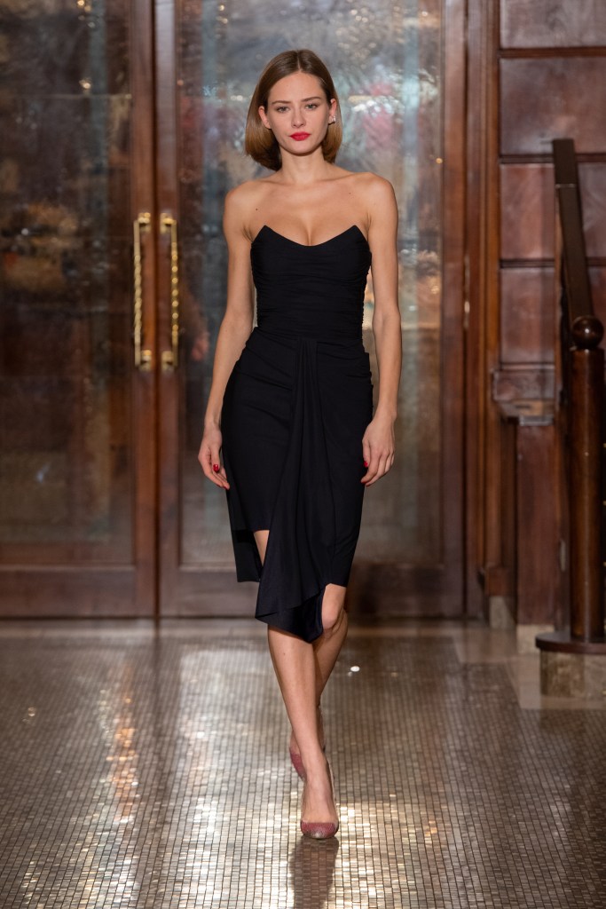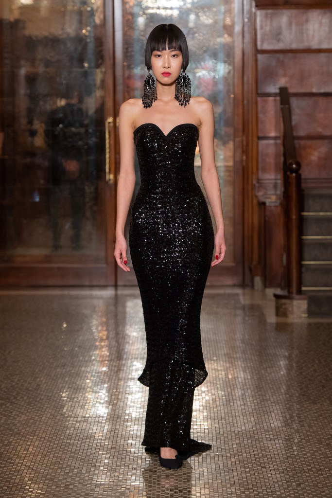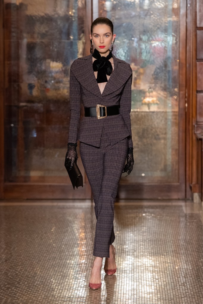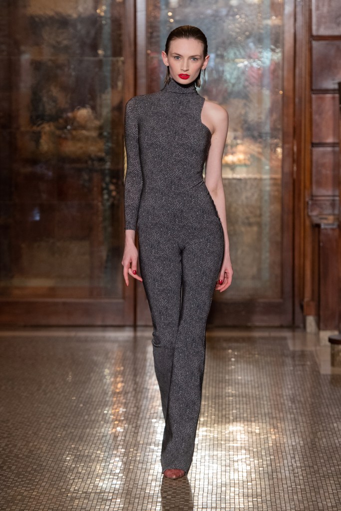 La proposta di abiti, tagliati in un’ampia gamma di forme, ha presentato modelli con bustier incorporati, mentre le tute sono state proposte in versioni più fluide o più scultoree. I suit includono un nuovo smoking iper chic con rever e dettagli in raso.