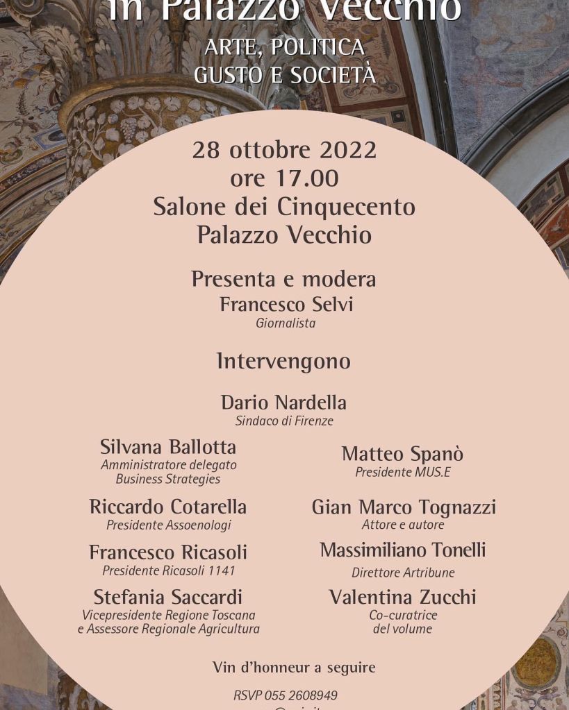 A fare gli onori di casa il Sindaco di Firenze Dario Nardella, insieme a Silvana Ballotta, esperta di economia e di marketing, Stefania Saccardi, assessore regionale già vicepresidente della Regione Toscana, Riccardo Cotarella, enologo di fama internazionale, Francesco Ricasoli, produttore di un rinomato Chianti classico nell’azienda di famiglia (Castello di Brolio) e discendente del Barone Bettino Ricasoli che del Chianti può essere considerato quasi l’inventore, avendone stabilito il disciplinare, Matteo Spanò, Presidente del Consiglio Direttivo Associazione MUS.E, Gian Marco Tognazzi, figlio del grandissimo attore Ugo Tognazzi e noto attore lui stesso, nonché produttore di vini, Massimiliano Tonelli, già Direttore editoriale del Gambero Rosso ed oggi Direttore della testata Artribune, da lui stesso fondata, Valentina Zucchi, responsabile scientifico di Palazzo Medici Riccardi a Firenze e del Museo delle Terre Nuove a San Giovanni Valdarno nonché autrice appunto del volume in oggetto, ed al giornalista Francesco Selvi in veste di moderatore, i quali, con l’occasione, oltre alla presentazione dell’interessante volume, racconteranno anche aneddoti, storie e ricordi, sempre ispirati ai valori legati alla cultura del vino.