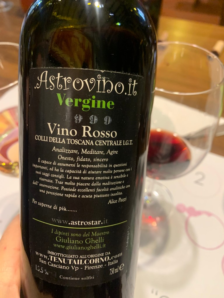 Cornorosso Astrovino Rosso Toscano IGT 1999: 12 etichette diverse per ogni segno zodiacale disegnate dal noto pittore Giuliano Ghelli, mentre la descrizione a cura dell’astrologa Alice Pazzi. Il blend di vitigni di questa vecchia annata è: Cabernet Sauvignon, Merlot, Colorino e Sangiovese. Si presenta di colore rosso granato con riflessi rosso aranciato, luminoso. Sentori terrosi, leggere note di vaniglia, frutti rossi, sottobosco e frutta sottospirito. Tannini ben integrati persistenza gusto olfattiva e ottima freschezza.