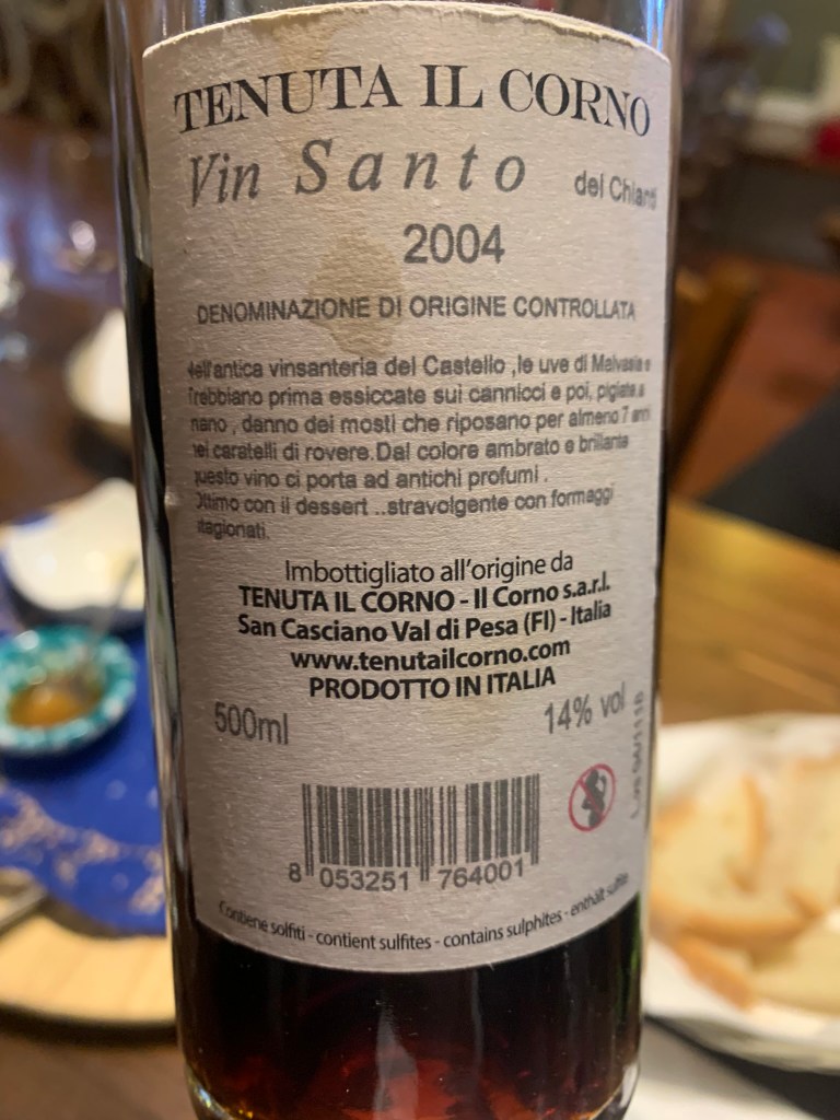 Vin Santo del Chianti DOC 2004: Trebbiano, Malvasia, San Colombano, e in questa annata anche Colorino. Colore Ambrato con riflessi dorati. Al naso molto intenso con note di miele, noce, fichi. Al palato morbido e persistente.