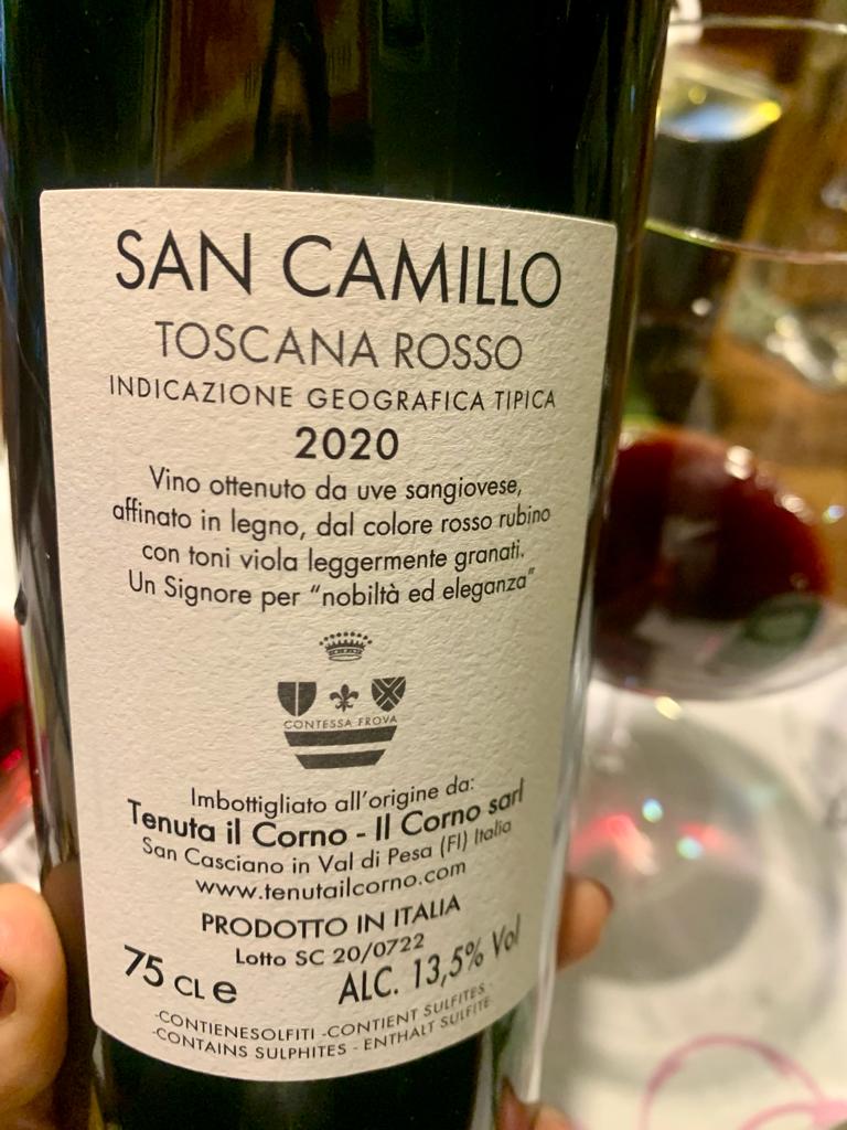 San Camillo Rosso IGT Toscana 2020- Sangiovese in purezza, fermentazione controllata in acciaio e malolattica, cui segue affinamento di 6-9 mesi in barrique di secondo passaggio e un ulteriore affinamento in bottiglia di 6 mesi. Colore rosso rubino impenetrabile con sfumature granata. All’olfatto note speziate di pepe, tabacco, floreale di rosa e viola passita, giaggiolo, note fruttate di confettura di frutti di bosco. Nel complesso un buon equilibrio tra tannini, freschezza e sapidità.