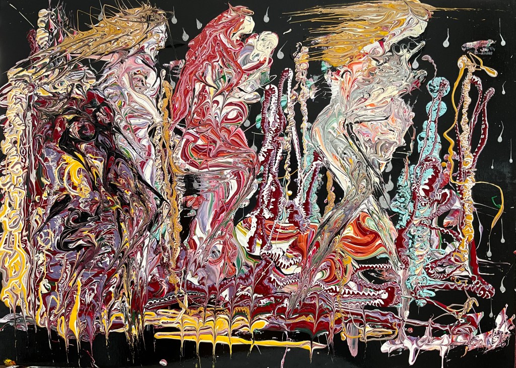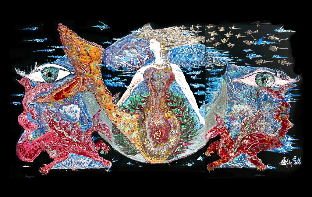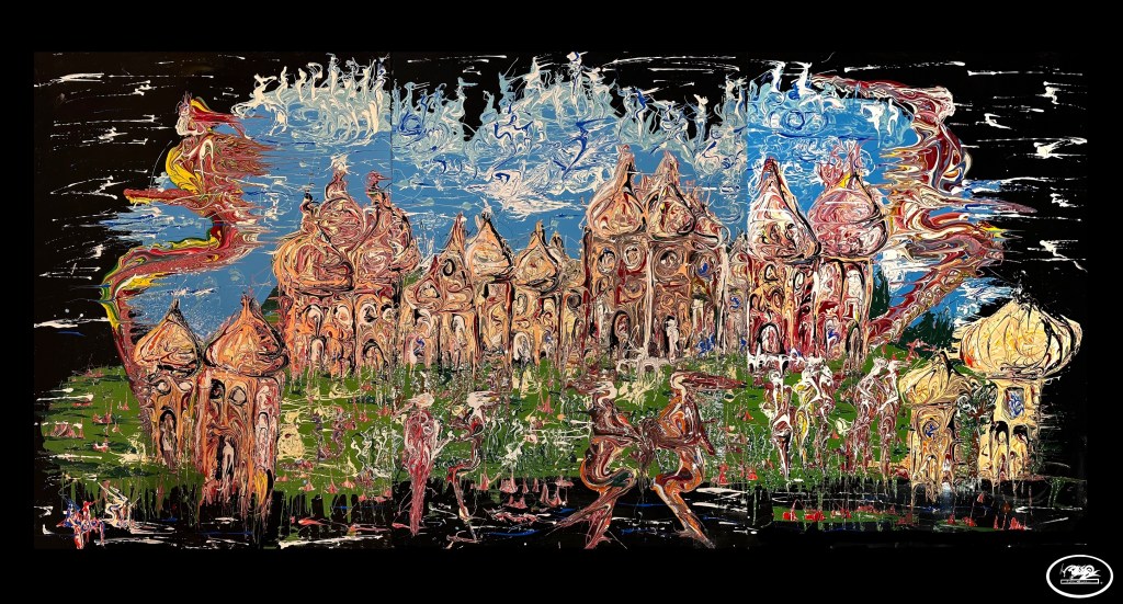 Le vibrazioni cromatiche nei suoi dipinti, attraversando la ciclicità dinamica delle curve barocche, danno al visitatore la sensazione di trovarsi in un labirinto. Con le frequenze energetiche che emana, l’artista crea fasci di forme nelle sue prospettive, invitando chi è di fronte alla tela a scoprire costantemente nuove dimensioni.