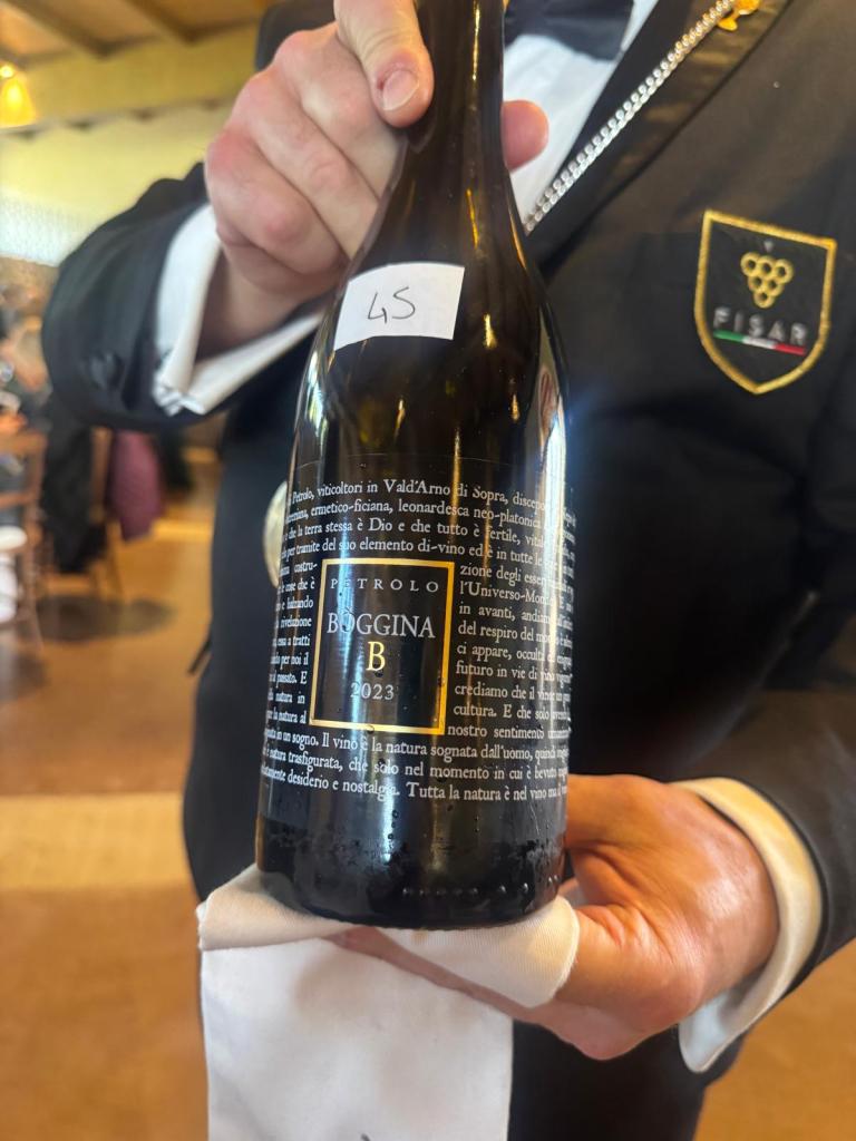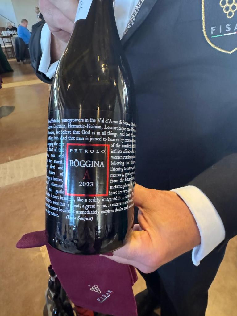 – Petrolo Val d’Arno di Sopra doc Sangiovese Bòggina A – 2023- fermentazione e affinamento in anfora. Al naso si apre con note di frutti rossi ciliegie, fragole, balsamico e spezie dolci. Il sorso è fresco succoso di buona persistenza.