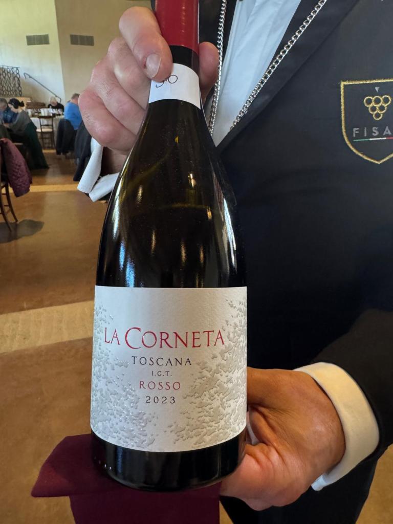 – Tenuta La Corneta- Toscana Igt rosso – La Corneta Rosso – 2023 (sangiovese, pinot nero) fermenta in acciaio e affina in barriques. Biologico.Colore Rosso rubino luminoso. Al naso si apre con note di amarena, fragola, melograno, spezie dolci e sottobosco. Il sorso è fresco il tannino fine. Un vino elegante.