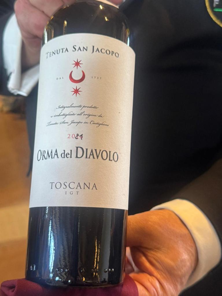 – Tenuta San Jacopo – Toscana Igt rosso – Orma del Diavolo – 2021 (sangiovese,merlot, cabernet sauvignon) fermentazione in acciaio e affinamento in barriques- botte grande. Biologico.Coloro rosso rubino. Al naso fruttato di amarena, fiori appassiti e spezie dolci. Il sorso ampio con tannino equilibrato.