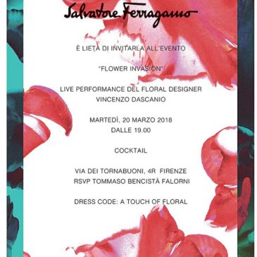 Proprio alle porte con la Primavera Salvatore Ferragamo nel negozio di Firenze ha allestito in sintonia con la propria new collection, una vera “FLOWER INVASION” avvalendosi della collaborazione del floral artist Vincenzo D’Ascanio (artista del Four Seasons di Milano e Firenze). Nel corso del Cocktail party D’Ascanio ha creato dei magnifici  cadeaux floreali con i … More FLOWER INVASION – SALVATORE FERRAGAMO FIRENZE –20.3.2018